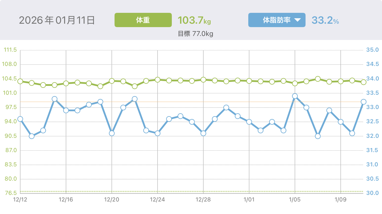 まずは現実を直視するために、1週間ごとの体重推移を記録します。とはいえ、100kgオーバーの今の私は「記録するだけで痩せる」なんて可愛いレベルじゃありません。今回は、ガチガチの「食事管理」と、膝が爆発しない程度の「運動」を組み合わせる総力戦で挑みます。