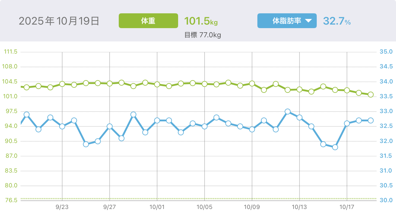 土曜朝の体重:101.1kg 前週比:-1.1kg