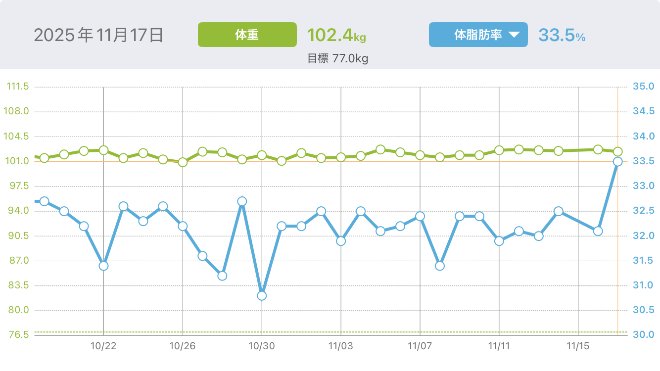 日曜朝の体重:102.4kg 前週比:+0.5kg